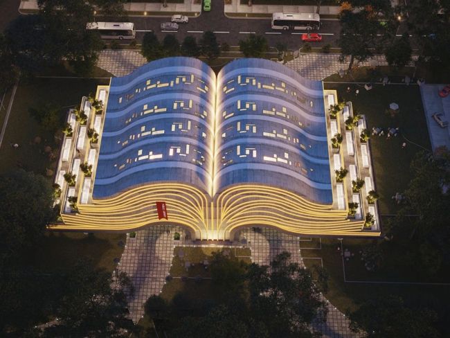 The architectural concept draws inspiration from the universally familiar form of an open book, a symbol as enduring as reading itself. Far from a decorative gesture, this metaphor embodies the ideals of openness, shared learning, and the limitless potential of discovery. The structure’s sweeping curves evoke the motion of turning pages, while illuminated rooflines mimic flowing text—suggesting that stories are not just housed within, but radiate outward, visible even from afar.