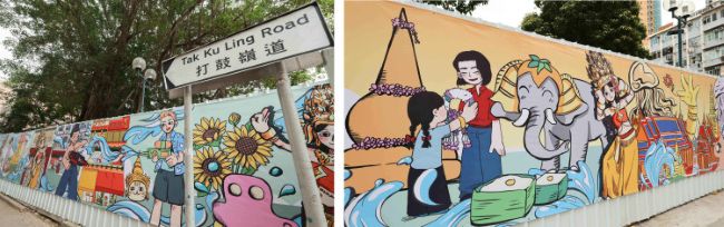 Public art and streetscape enhancement works by the Urban Renewal Authority (URA) along Tak Ku Ling Road, Kowloon City, featuring community-themed murals that celebrate local culture and history as part of the district’s revitalisation programme.